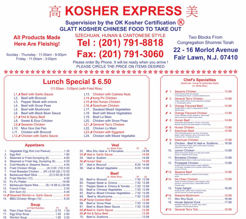 Welcome to Kosher Express, a Chinese restaurant located in Fair Lawn, NJ, offering a classy and quiet dining experience with options for delivery, takeout, and catering. This hidden gem has been serving consistently good food with a focus on traditional flavors and high-quality ingredients. Customers have raved about dishes like egg drop wonton soup, Chicken and Broccoli, beef egg rolls, General Tso's chicken, and more. The establishment's dedication to providing fresh food and excellent service is evident, with a full-time mashgiach for kosher supervision. While only accepting cash or checks, the accommodating staff is flexible with substitutions. With a loyal customer base and rave reviews, Kosher Express is a go-to spot for delicious Chinese cuisine that's sure to satisfy your cravings.